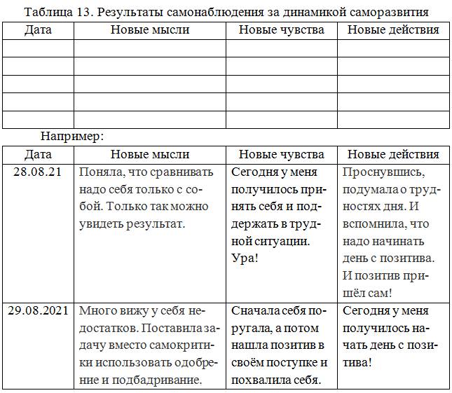 Затем в произвольной форме, рекомендуется вести дневник самонаблюдения, в который следует записывать то новое, прогрессивное, что появилось. Можно записывать по датам новые мысли, новые чувства и новые действия, в такую таблицу.