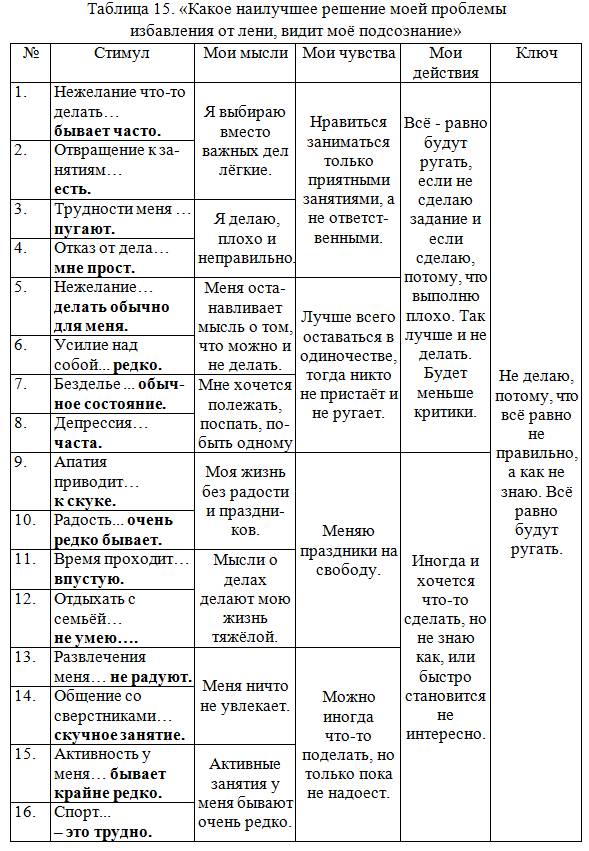Иван обратился с запросом: «Почему меня часто одолевает лень?». Он жаловался на захватившее его безделье. Одним из методов работы с проблемой использован модифицированный тест «16 ассоциаций» К. Юнга [35].