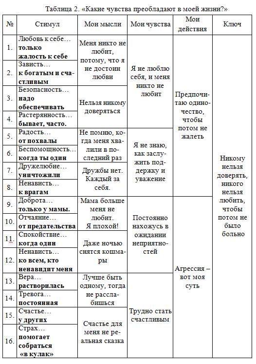 Инструкция к тесту. Вам предлагается бланк с 16-ю стимулами – словами (незаконченными предложениями), характеризующими чувства, преобладающие в Вашей жизни. Чтобы вызвать свободные ассоциации, необходимо несколько секунд внимательно смотреть на формулировку вопроса, написанного над таблицей «Какие чувства преобладают в моей настоящей жизни?».