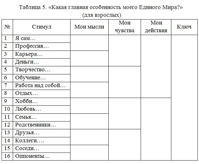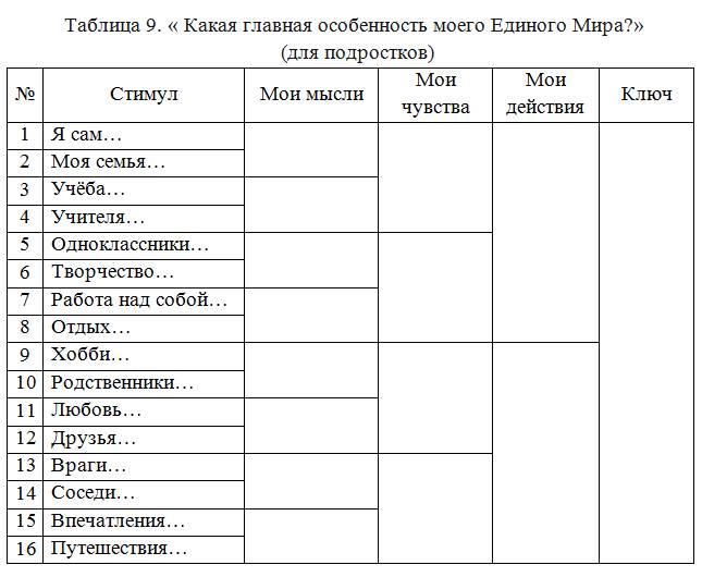 Итак, по заданному образцу можно приступить к выполнению Вашего упражнения. Сначала следует изучить Внутренний Мир «Я и Я», затем Внешний мир «Я и Другие», и, наконец, Единый мир. Сравнение результатов даст возможность глубже осмыслить себя. В упражнении представлены два варианта: для взрослых и для подростков (обучающихся).