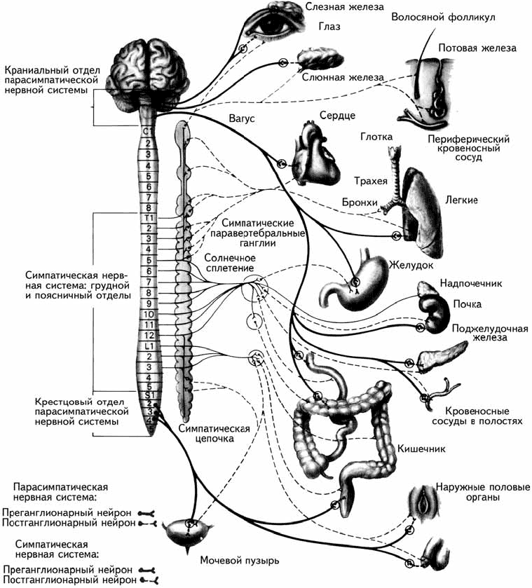 Результаты активности этих двух систем во многом противоположны. Если основная функция симпатической нервной системы состоит в мобилизации организма на борьбу или бегство, то парасимпатическая нервная система преимущественно обеспечивает поддержание гомеостаза. Активация симпатической нервной системы лежит в основе поведения человека, рвущегося в бой. Возбуждение парасимпатической нервной системы обеспечивает пищеварение у человека, лежащего на диване после сытного обеда (вспомните тест Александра Македонского с горящим факелом, описанный во введении).