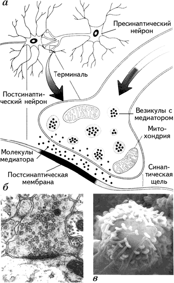 Рис. 1.15. Структура синапса (а); фотография синапса, увеличенного под электронным микроскопом в тысячи раз (выполненная D. D. Kinkel) (б); фотография аксональных терминалей на теле аксона (в) (Kalat, 1992).