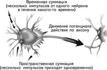 Рис. 1.16. Временная и пространственная суммация импульсов (Kalat, 1992).