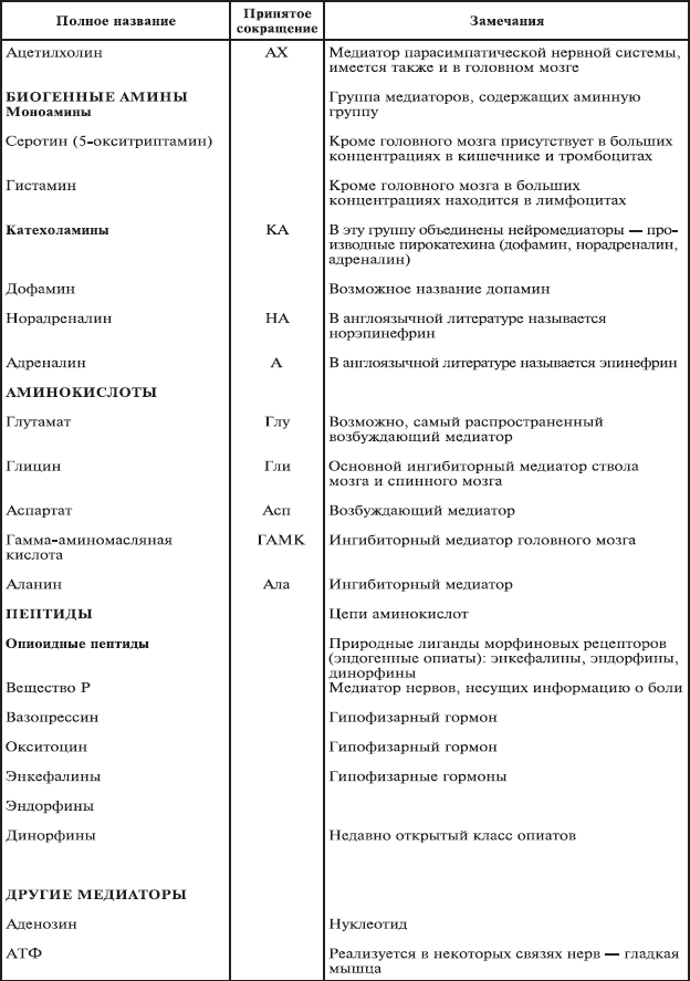 Все медиаторные соединения – это низкомолекулярные водорастворимые (дипольные) амины или аминокислоты и родственные им вещества. Ацетилхолин и катехоламины синтезируются из циркулирующих в крови предшественников, тогда как аминокислоты и пептиды в конечном счете образуются из глюкозы. Свидетельством консерватизма живой природы является то, что, несмотря на различие циркуляторных систем и метаболических путей, беспозвоночные и позвоночные животные в равной степени используют большинство общих медиаторов (табл. 1.3).