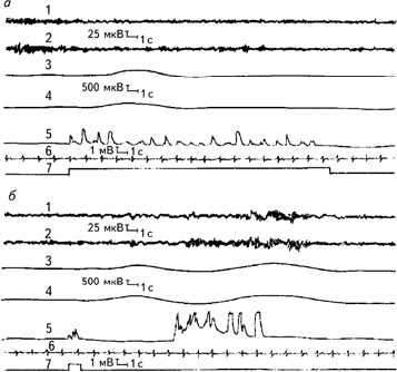Рис. 2.2. Образец многоканальной записи физиологических функций испытуемого при прослушивании (а) и воспроизведении (б) списка слов. 1, 2 – ЭЭГ, отведения О1 и О2 левое и правое полушария соответственно; 3, 4 – КГР левой и правой руки; 5 – фонограмма (сигналы появляются в моменты предъявления слов магнитофоном или при устных ответах испытуемого); 6 – ЭКГ; 7 – отметка программы опыта (Леутин, Николаева, 1988).