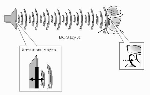 В результате колебания передаются по воздуху на расстояние, т. е. в воздухе распространяется звуковая или акустическая волна, или, попросту, звук. Звук, достигая уха человека, в свою очередь, возбуждает колебания его чувствительных участков, которые воспринимаются нами в виде речи, музыки, шума и т. д. (в зависимости от свойств звука, продиктованных характером его источника).