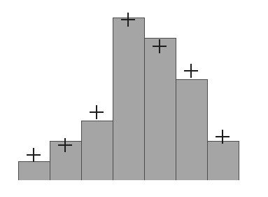 Поясним сказанное на простом примере (рис. 1.11). Рассмотрим малый интервал времени, для которого имеется несколько измеренных значений интенсивности (для определенных отсчетов времени с равными промежутками). Эти значения интенсивности обозначены на рисунке крестиками. Если использовать высокую глубину кодировки, то при помощи достаточного числа бит информации можно записать в звуковой файл данные значения интенсивности с большой точностью (столбики на рис. 1.11, б). Однако, в целях уменьшения размера файла, глубина кодировки может быть уменьшена. Это означает, что имеющееся в распоряжении компьютера число бит информации будет недостаточным, чтобы записать точные значения интенсивности, а вместо них в файл будут записаны наиболее близкие допустимые значения (столбики на рис. 1.11, а). Разумеется, из – за отличий в исходном звуковом сигнале и записанной в аудиофайл информации качество воспроизведения звука во втором случае будет гораздо худшим. Подчеркнем, что в обоих случаях использовалось одинаковое значение частоты дискретизации.