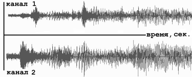 Упомянем о хорошо известном всем стереофоническом эффекте, позволяющем синхронно воспроизводить из двух различных динамиков различный звук. Как известно, формат Моно связан с записью в аудиофайл одной звуковой дорожки, а формат Стерео – двух (в последнем случае размер файла по сравнению с монофоническим удваивается благодаря записи в один аудиофайл двух зависимостей интенсивности звука от времени – пример показан на рис. 1.12).