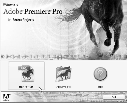 После загрузки на экране возникнет окно приложения Premiere, на фоне которого появится диалоговое окно с приглашением Welcome to Adobe Premiere Pro (Добро пожаловать в Adobe Premiere Pro). В данном окне нажатием соответствующей кнопки можно либо начать монтаж нового проекта – New Project (Создать проект), либо открыть существующий файл проекта – Open Project (Открыть проект), либо обратиться к справочной системе – Help (Помощь) (рис. 2.1). Если вы выберете опцию создания нового проекта, то перед загрузкой содержимого основного окна Premiere вам будет предложено определить его установки, т. е. основные параметры, определяющие настройки окон, в которых будет происходить редактирование проекта (размер изображения фильма, частота кадров, способ нумерации кадров и т. п.).