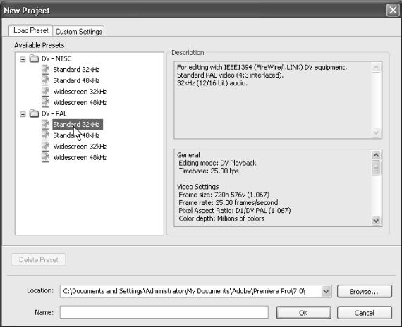 2. Выберите в левом списке Available Presets (Доступные предустановки) открывшегося диалогового окна New Project (Создание проекта) пункт DV – PAL – Standart 32kHz (Цифровое видео – стандарт PAL – Стандартный звук 32 кГц) (рис. 2.2). Это будет означать, что для дальнейшей работы мы выбрали набор установок, составленный разработчиками Premiere, предназначенный для создания фильма в формате PAL (европейском стандарте телевидения). После того как вы выберете одну из предустановок, параметры, составляющие ее набор, отобразятся на панелях Description (Описание) справа.