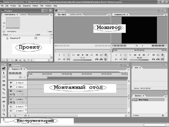 После определения установок в основное окно Premiere загрузится несколько дочерних окон, каждое из которых предназначено для проведения определенных операций по монтажу фильма (рис. 2.3). Самыми важными являются три окна: