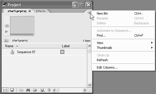 Все окна допускается перемещать по экрану (перетаскивая за заголовок окна) и изменять их размер (перетаскивая нужную границу окна), настраивая тем самым рабочую область в виде, наиболее удобном для конкретного пользователя. Одно из окон всегда является активным, о чем говорит яркий цвет его заголовка. На рис. 2.3 активным является окно Project (Проект). Все действия пользователя в Premiere (включая применение горячих клавиш) касаются активного окна. Для того чтобы сделать то или иное окно активным, достаточно щелкнуть мышью в его пределах.