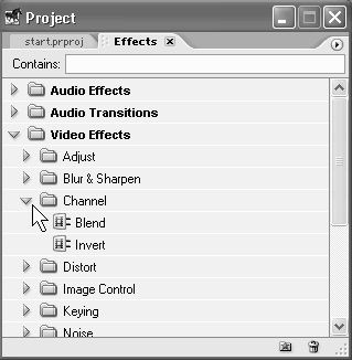 Рис. 2.12. Эффекты, имеющиеся в Premiere, организованы в виде иерархического вложенного списка закладки Effects