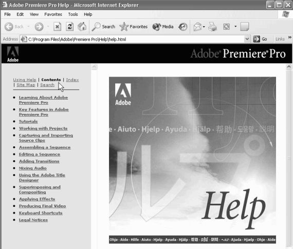 □ Contents (Содержание) – статьи справки Premiere, расположенные по порядку в соответствии с оглавлением;