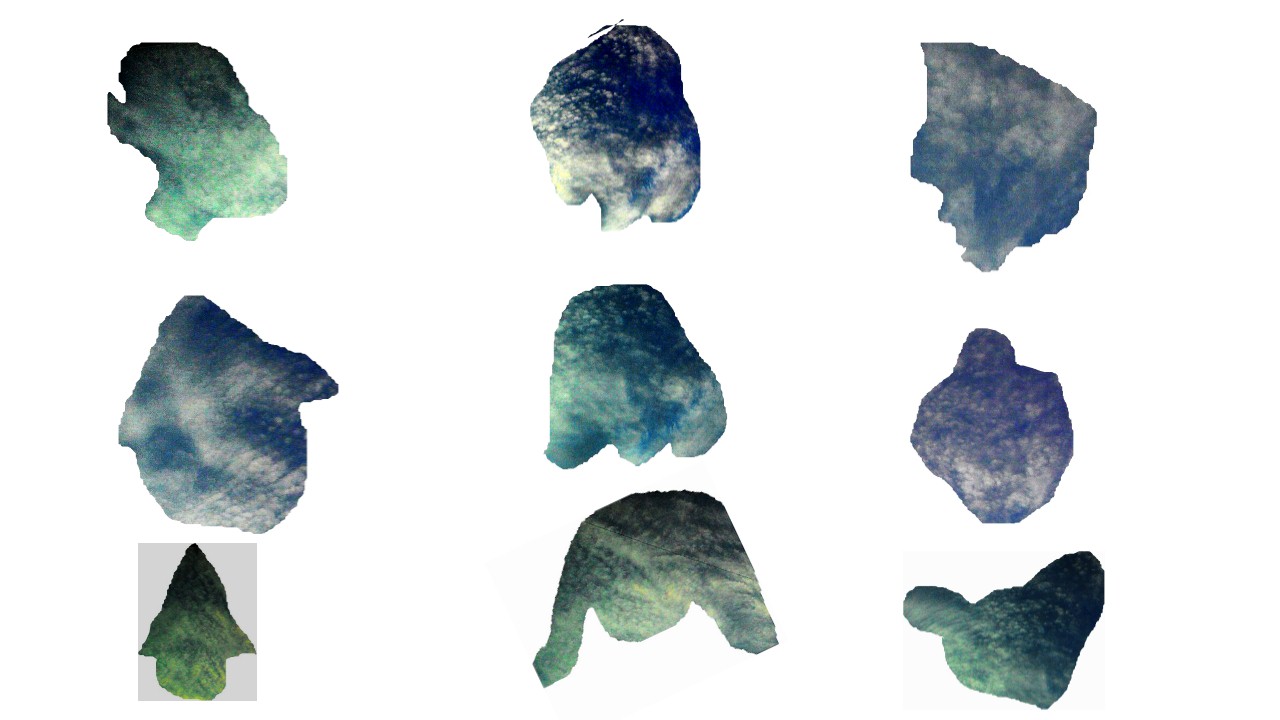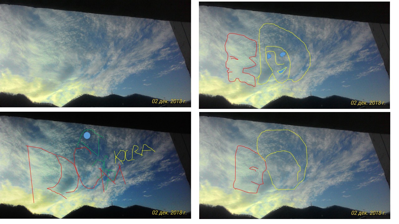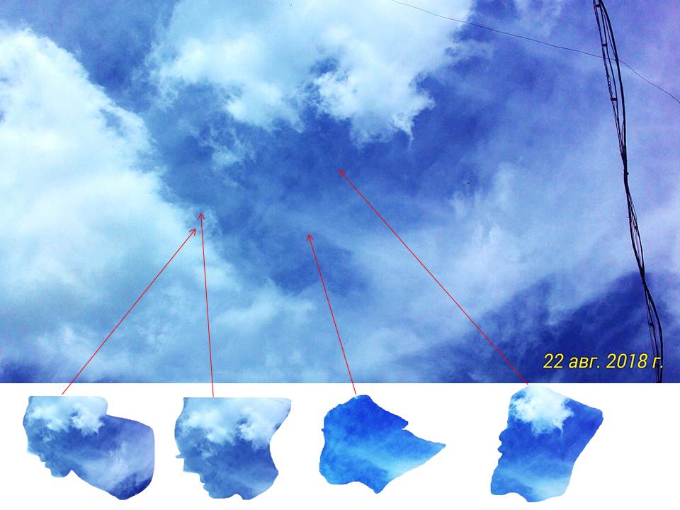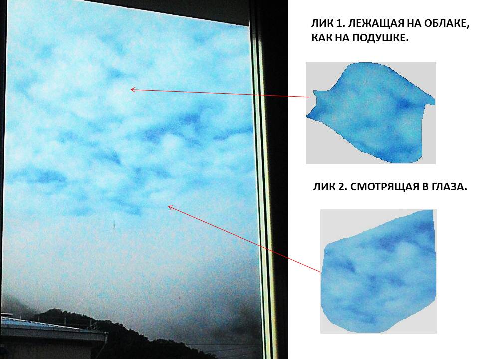 Лики, которые видны на небе с облаками, вынесены по низу фотографии. Особенно интересен средний лик с огромными глазами и ресницами: