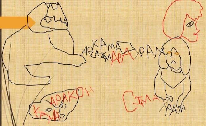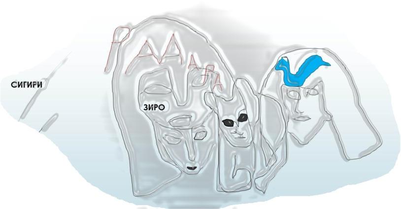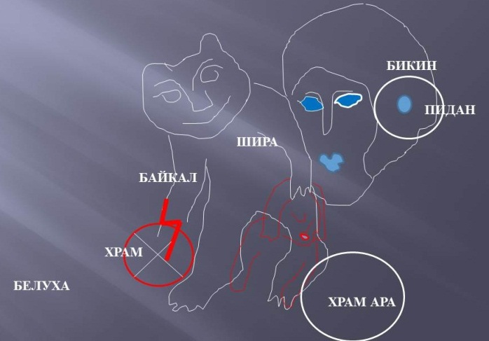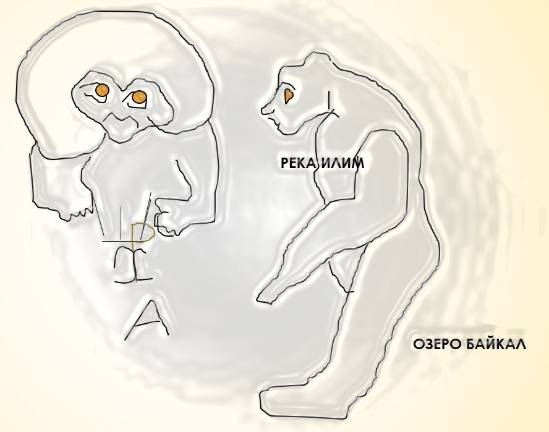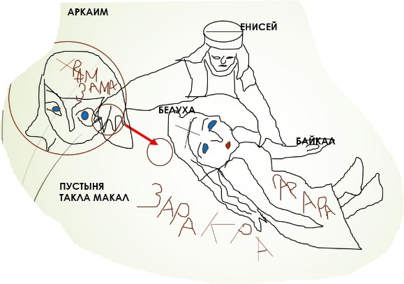 Становится понятным, что это значит, если прочитать надписи: «Шира (Сириус). Шар Мара (богини смерти)», «Храм Зама. Зиран (пустота, космос). Зри сова». Выходит, что арий Зама (переводится как время, не трогать) спасает человека от Сириуса, что подтверждают тексты предыдущей книги. Угроза, кара Земле шла от Сириуса. Вот вам и «освобождённая» Земля, которую мне сказали тексты «явить», я «явила». Только есть на планете ещё один Ибис – птица, которую я нашла по надписям на камнях. На её спине лежит озеро Байкал, а в ней – девочка, ребёнок, это Дия, которую тянет Митра (связыватель миров) в чалме от храма Зама: