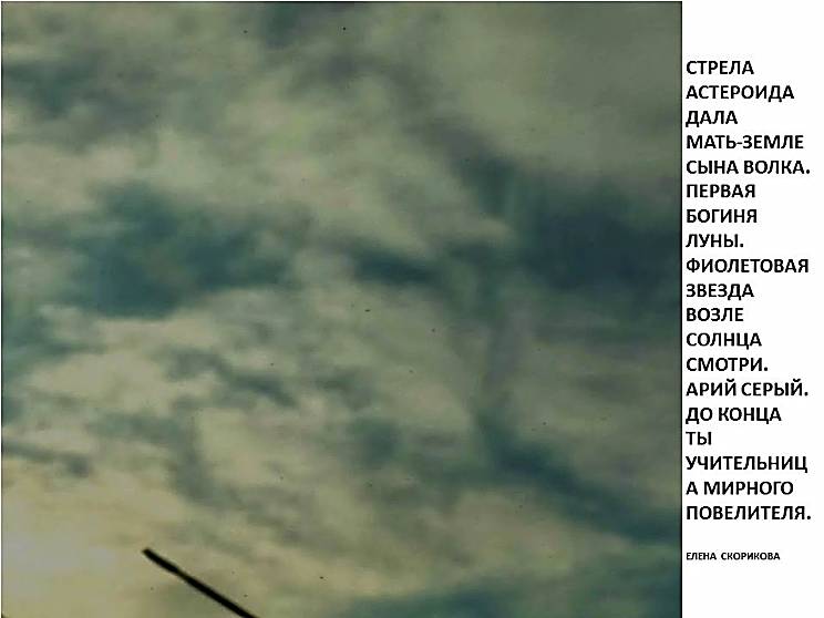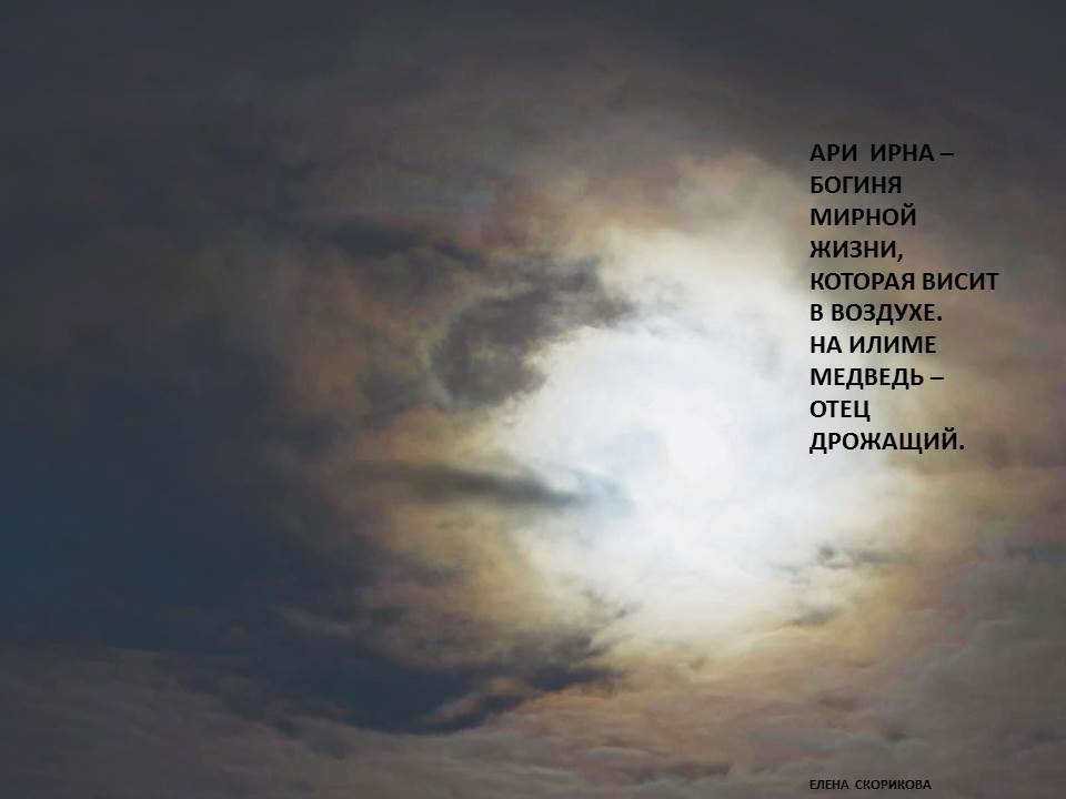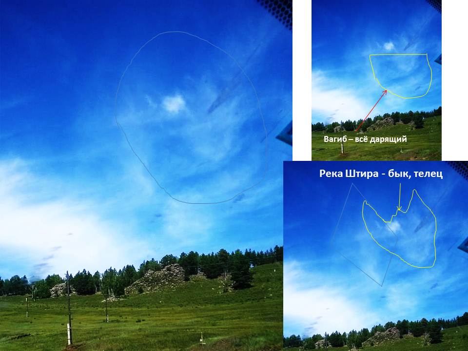 На меня смотрели два женских лица, судя по пухлым губкам и мягким очертаниям лиц. Читаю послания. Лик верхний: «Мирное небо Аро. Ивисы ров вращай, освобождённую яви». Лик нижний: «Солнца свет – разрежённый Аум (слово силы, троица). Разрежённая Амазонка Сибил (пророчица). Ирар (река)». И полностью облака: «Зоркая, смотри арки Аркаима, низменность. Красная утка. Смотри Ари великого». Ну, это послание для меня, облака называют меня «зоркой». Благодарю, Бог облаков Эфир, Эфир – это не только бог облаков в древности, но и первоэлемент, открытый русским учёным Менделеевым. Википедия даёт информацию, что эфир – «это гипотетическая всепроникающая среда, колебания которой проявляют себя как электромагнитные волны (в том числе как видимый свет). Концепция светоносного эфира была выдвинута в XVII веке Рене Декартом и получила подробное обоснование в XIX веке в рамках волновой оптики и электромагнитной теории Максвелла. Эфир рассматривался также как материальный аналог ньютоновского абсолютного пространства. Существовали и другие варианты теории эфира. В конце XIX века в теории эфира возникли непреодолимые трудности, вынудившие физиков отказаться от понятия эфира и признать электромагнитное поле самодостаточным физическим объектом, не нуждающимся в дополнительном носителе». Вот, когда начался обман в теории устройства мироздания. Попробуем проверить информацию от Эфира, бога облаков.