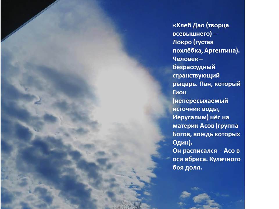 Действительно, есть Бог облаков и не один. Придётся поверить в духов. Облака можно, в целом, прочитать: «Рыба рода ибиса (ибис – дух, Рибирица есть в Болгарии). Мечтательная. Дирим (есть Дидим в Турции) – медведь, двойной. Ари с медведем зри. Мягкая тётя сидит, Ширва (Ширван – в Азербайджане, Ширванская в Краснодарском крае). Мокрого рыло, цветущий мужчина, рарог (сокол) – Морибури (Марибор есть в Словении)». Сокол у нас только один есть на планете. На него уже не раз указывали тексты на скалах и мегалитах, но теперь сказали облака! Это как раз возле Марибор: