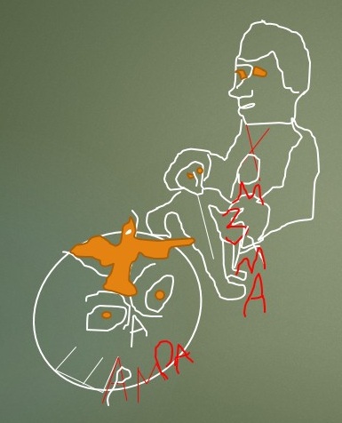 Здесь явно видно бледное пятно над головой дочери. Если уменьшить яркость и увеличить контрастность снимка, то увидим облики и буквы:
