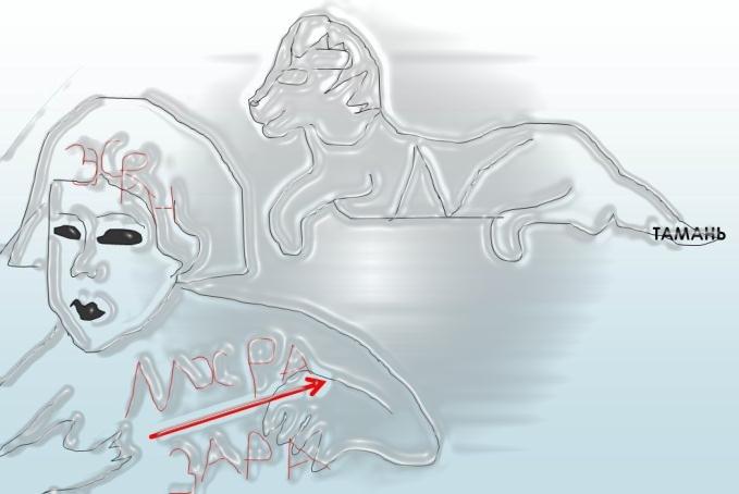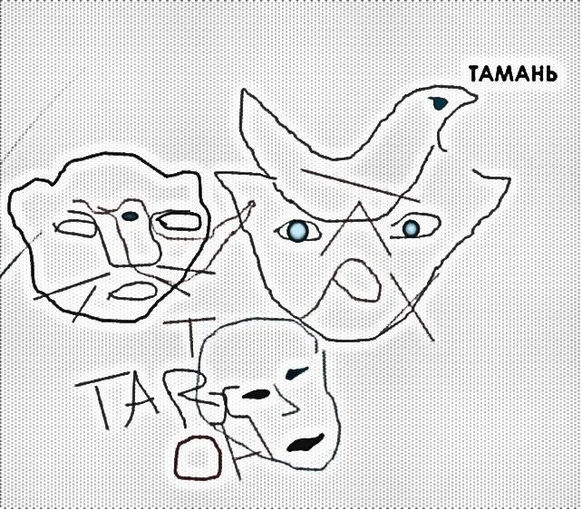 Два больших глаза видны на небе. Буквами выписано «Таман. Там Тарха храм. Карма Рама». А на воде видны цифры 375 и слова «Шира. Там зов Мари. Рокот Зибра». На рельефе у Тамани видим женщину с ребёнком на руках, которых я уже показала в другой книге, есть там и рогатая морда Тарха и трон Тары (там много птиц и лев):