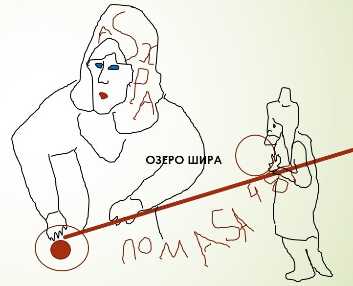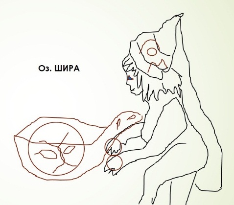 На обоих шарах видна плотная оболочка, свечение, мордочки и написано «тор». На верхнем: «Тор стройного амира (господина), бессмертного. Шира – шар, Рама храм. Аниси (благотворная, Википедия) Мара. Сжатый Хама (город в Сирии, сын Ноя, Википедия)». На нижнем: «Зри Роара (знаменитый копьеносец, сайт names.neolove.ru). Дом Зама. Зри ров, гора. Фира (красивая). Тарх». Сразу видим, что тема обров – славянская, бог Тарх, богиня Мара, другое имя которой – Морена (Мара, Марена, Моржана, Морана) – славянская Богиня Зимы и Смерти. С именем Морены созвучны многие страшные слова «мор», «морок», «мрак» и даже «смерть». Богиню Морену побаивались, однако, уважали. Особенно на Севере, где сильна власть долгой зимы, помнили о важности обращений к Богине Морене. Упоминания имени Морены встречаем в текстах северных заговоров. Уговоры, обращенные к Богине Смерти, чаще всего читают для доброго дела, например, исцеления от хворей. Считают, что именно Богиня Зимы способна прогнать болезни, приходящие вместе с холодами (сайт Славяне). Как всегда, проверить текст можно по рельефу Земли. На реке Шира я уже показала множество ариев и Тарха. А на рельефе около озера Шира Хакасии есть кое-кто другой: