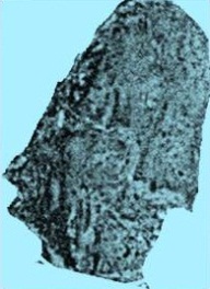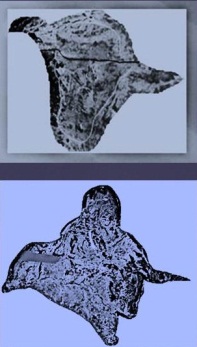 Здесь очертания каменного ящера полностью соответствуют очертаниям созвездия Большого Пса. Каменный ящер обернул голову к зрителю. На его хохолке выбиты буквы Х, О, М, то есть, ХОМ. В перекрестии Х находится Сириус, к нему от хвоста ящера подходит стрела, рядом с которой выбито лицо, как у знакомого нам лица инопланетянина. Над его головой выступает коромысло, это буква Д, тут же выбиты О и М. Это означает ДОМ ХАМА, ниже выбито ШИРА, что означает древнее название Сириуса (узнала из программы РЕН-ТВ).