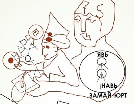 На одной оси в круге идут кружки Яви и Нави. Зиса держит на руках человека поменьше – это Тот, которые тоже управляют звёздными мирами. Выходит, Северное полушарие звёздного неба – мир Зисы, это Явь. А Южное полушарие – мир Зама, это Навь. Слово «навь» означает «мертвец», «смерть», «сон». Оно является славянским, и родственно древнегерманским аналогам в том же значении, восходя к индоевропейскому языку. Слово «явь» используется в русском языке для обозначения действительности как противопоставления сну, мечте или бреду. Происходит от православного «ясно, известно». В современном русском неоязычестве навь – это мир «загробный», тогда как явь – это мир живых, мир явленный. Это так и есть: одна сторона Земли освещена Солнцем, там день, Явь, а противоположная сторона находится в темноте – там ночь, сон, поэтому и Навь. Явь, правь и навь – в современном русском неоязычестве «три стороны бытия» или «три мира славянского мифологического миропонимания». Впервые эта триада упоминается в Велесовой книге. Издатель (и вероятный автор) Велесовой книги Ю. П. Миролюбов трактует эти термины так: «…Нам удалось только после долгих усилий установить, что «Явь» была реальностью, «Правь» – истина, законы, управляющие реальностью, и наконец, «Навь» была потусторонним миром, где была «Явь», не связанная с «Правью», а потому бестелесная. …Усопшие приходили «из Нави, окуду никто вена не приходит венити». Такое общение с усопшими происходит в Яви через Навь, сон. Рай, или божественное обиталище, где … Предки, Пращуры и Шуры …, общается с Явью через Навь. Это как бы промежуточная ступень, ибо если мы живем в Яви, если сама Жизнь, истечение Живы сквозь время и пространство может идти лишь благодаря Прави – основе, существующей под ней и установленной богами (ипостасями Сварога), то в будущем человек «вдет внави», то есть в загробное существование. Таким образом, смерти не было, а было лишь созерцание «внави зряти» тех, кто ушёл». В интерпретации А. Асова (1992 год) должно означать: «Ибо что положено Даждьбогом в Прави, нам неведомо. А поскольку битва эта протекает в яви, которая творит жизнь нашу, а если мы отойдём – будет смерть. Явь – это текущее, то, что сотворено Правью. Навь же – после неё, и до неё есть Навь. А в Прави есть Явь» (Википедия). Таким образом, Северное полушарие звёздного неба есть Явь, а Южное – Навь, как нарисовано и на рельефе Земли в районе Замай-Юрт. Тот держит в руках сферу, рядом с которой выбито «Нара (бессмертный) Тот».