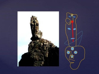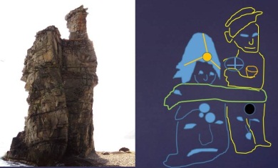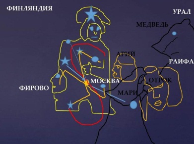 Три звезды, как знак Знамени Мира, находятся у стоп созвездия Близнецов. Так что, перед нами не просто скала Белая Церковь, стоящая на берегу Японского моря, а объёмная космическая карта тела, сотканного из звёзд и космической пыли, с трёх сторон. Ещё одна сторона осталась неизученной, она обращена к морю, но можно догадаться, какие звёзды там будут показаны (вид скалы Белая Церковь сверху, со спутника):