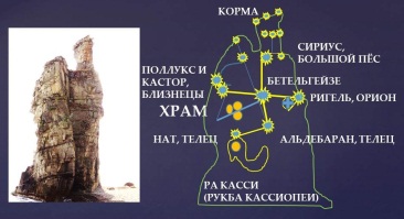 В совокупности, по обведённым буквам на скале читатель увидит слова: «Храм Захара. Ра. Митра. Зара. Трон Тота». Ещё я рассмотрела звёздочки и текст: «Шира дом (Сириус, Большой Пёс). Полар (Полярная звезда). Полиш (полюс). Кот. Карма там. Шар Ра Диа (Дия) тиара (головной убор) – три Ра: Шира (Сириус), Зара (Венера), Зира (звезда Альзирр, Кси Близнецов, сайт astrokot.kiev.ua/slovar) рахат (адепт, сайт Академик). Тьма номо (закон). Ра дира (дыра). Атри (древнеиндийский мудрец, сайт Академик) ритин (красная крепость, Википедия) Ра. Ара тор. Грот. Нора Тора (бог грома и молнии, как Перун, Википедия)». На схеме это выглядит так: