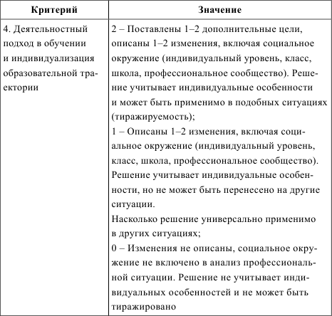 Критерии оценки решений кейсов студентами (разработаны в рамках выполнения проектов по модернизации педагогического образования) [3]. Разработчики предлагают ответы на все задания кейса оценивать по шкале 0, 1, 2 балла и использовать комплекс четырех критериев. Критерии и их конкретизация приведены в таблице 23.
