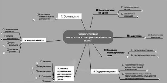 Пример ментальной карты приведен на рис. 4 (https://www.mindmeister.com/ru/183361160/ Дата обращения 5.04.2015). Ментальная карта является итогом задания по дисциплине «Проектирование и сценирование развивающих занятий с детьми в начальной школе». При этом рабочая программа дисциплины предусматривает не только составление ментальной карты (в данном примере – структуры урока), но и дальнейшую самостоятельную работу с ней студентов при выполнении практико-ориентированных заданий, например анализа урока в школе.