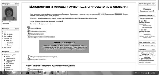 Пример. Дисциплина «Методология и методы научно-педагогического исследования» (рис. 5) содержит ряд элементов: форумы («Моя статья», «Научно-исследовательская практика» и др.); видео (защиты диссертаций – по ссылке на Youtube, научных конференций – ссылки на сайты научных организаций и др.); тесты; лекции; семинары; глоссарии; задания; опросы и другие элементы. Например, по размещенной ссылке (http:// www.ostu.ru/libraries/bibl_opisanie.php) студент переходит на сайт библиотеки на страницу с ГОСТом библиографического описания. Ряд ссылок отсылает студента к тексту статей (http://elibrary.ru/). В информационном пространстве курса также представлены программа курса, его учебно-методическое обеспечение, критерии выполнения заданий. Важно, что предусмотрена возможность оценивания выполненных студентом заданий и представления индивидуального портфолио (см. главу 5).