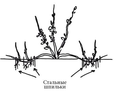 Посадочный материал можно получить с помощью отводков. Почву вокруг отобранного для размножения кустарника пропалывают, рыхлят и поливают. Затем рядом с кустом делают борозды, в которые пришпиливают пригнутые ветки (рис. 4). Место фиксации присыпают почвой и поливают. В нем вскоре образуются корни и молодые побеги. К осени или на следующий год отводок набирает силу, и его отделяют от материнского растения. Полученный молодой кустик сажают на постоянное место в саду.