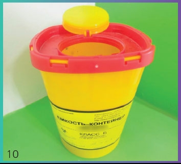 После процедуры утилизируются все одноразовые расходники, иглы или картриджи необходимо выбросить в специальные боксы с антисептической жидкостью. Затем снимается барьерная защита, и все поверхности, которых мастер мог касаться во время процедуры, обильно обрабатываются дезинфицирующим раствором. Например, эстилодез для поверхностей (время аппликации 10–15 минут). Далее поверхности вытираются насухо бумажными салфетками.
