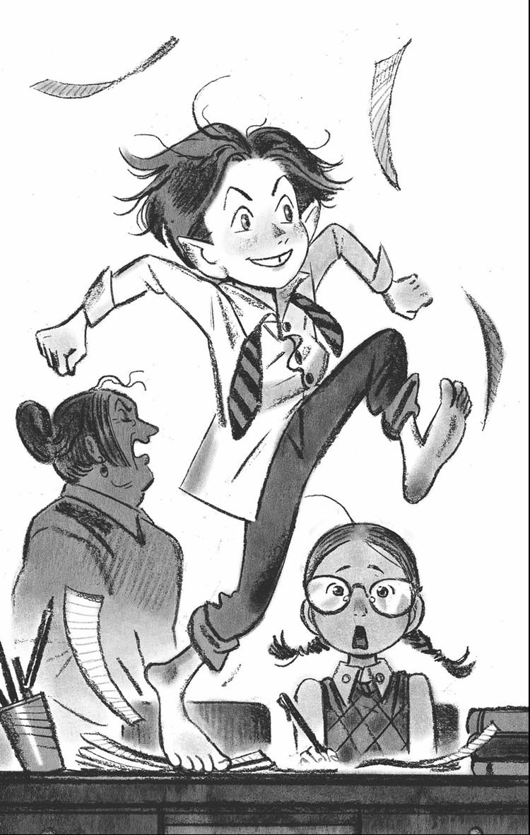 Первоклашка запрыгнул прямо на учительский стол и, усевшись там, начал скучающе болтать ногами. Юлька думала, что теперь-то уж Кикимора одёрнет нахального сорванца, но не тут-то было.