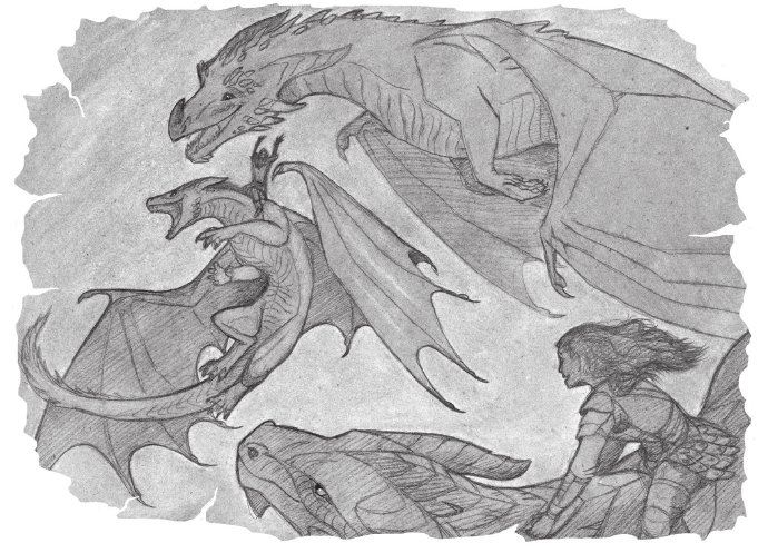 Драконица плыла по воздушным потокам и, не переставая, выделывала всякие штуки: стремительно пикировала, кружилась волчком в падении, носилась вокруг двух громадин-драконов, весело рычала, выдыхала в воздух голубое пламя.