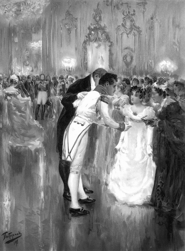 «Он предложил ей тур вальса. То замирающее выражение лица Наташи, готовое на отчаяние и на восторг, вдруг осветилось счастливой, благодарной, детской улыбкой. „Давно я ждала тебя“, – как будто сказала эта испуганная и счастливая девочка своей просиявшей из-за готовых слез улыбкой, поднимая свою руку на плечо князя Андрея».