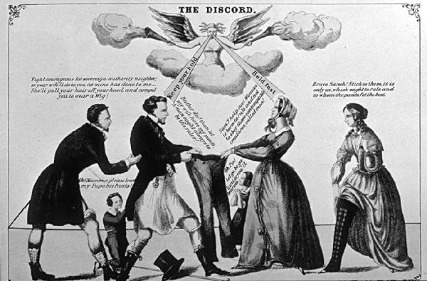 Реальные суфражистки не носили таких костюмов. Если «свободная художница» вроде Авроры Дюдеван, известной под мужским псевдонимом Жорж Санд, иногда надевала мужской костюм, то с весьма прагматичными целями (у Авроры не было денег на подобающие женщинам места в ложах, так что она использовала мужской костюм, чтобы попасть на дешевые места в партер). Если англичанка Эмили Блумер пропагандировала шаровары для женщин, то они шли в комплекте с отказом от корсетов и физическими упражнениями, которые должны были оздоровить «прекрасную половину» Англии, сделав деторождение более легким и менее опасным. Она не призывала женщин подниматься в этих панталонах на трибуны или участвовать в выборах в парламент. Хотя английские карикатуристы поспешили порадовать публику этими ужасными шокирующими картинками: жены дерутся с мужьями за единственные в доме штаны и, отвоевав их, отправляются в Парламент, оставив спутников жизни варить обед и нянчиться с детьми, а девушки в блумерах свистят вслед мужчинам на улице или приходят к их родителям… делать предложение.