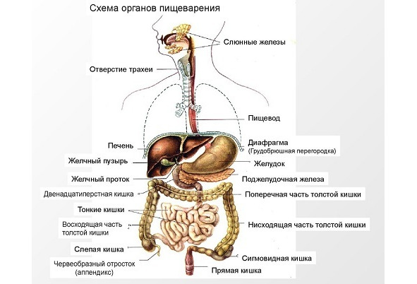 Пищеварительная система включает в себя ЖКТ плюс органы пищеварения. Желудочно-кишечный тракт состоит из следующих органов: рот (на схеме почти всех пациентов он почему-то отсутствует), гортань, пищевод, желудок, двенадцатиперстная кишка, тонкий кишечник, толстый кишечник, прямая кишка, задний проход или анус. Брыжейка, поджелудочная железа, печень и жёлчный пузырь являются органами пищеварения, так как принимают в нём непосредственное участие, но не являются органами ЖКТ.