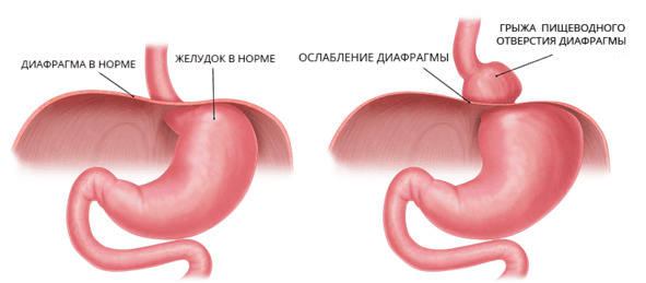 На начальных стадиях развития заболевания смещение органов возникает не постоянно, а под действием определенных факторов – физических нагрузок, сильного кашля, употребления избыточного объема пищи и др. При отсутствии лечения заболевание может привести к рефлюкс-эзофагиту, открытию кровотечения, прободению пищевода, ущемлению выпячивающихся органов и другим серьезным осложнениям.»