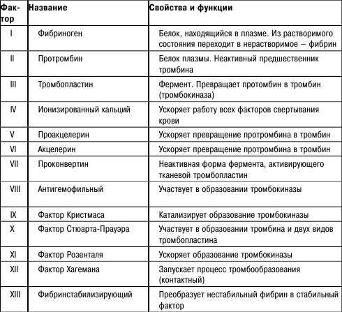 В процесс свертывания крови вовлечено много веществ. Двенадцать из них называются факторами свертываемости, но по принятой классификации они пронумерованы римскими цифрами от I до XIII, поскольку факторы V и VI выполняют одну и ту же функцию (см. табл. 2). Тем не менее и этот список можно считать неполным, поскольку в процессе задействован еще ряд веществ, например АДФ и серотонин. Поэтому проще будет кратко описать то, как образуется сгусток крови и что с ним происходит потом.