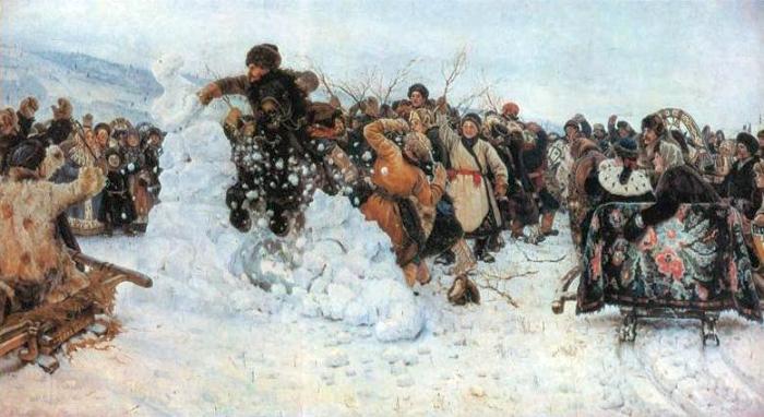 Кроме щедрого и обильного застолья масленица отличалась еще и многими увеселениями. На льду или на площадях возводились деревянные горки с нарядными павильонами, где разворачивалась бойкая торговля горячим сбитнем, сладостями, орехами и блинами. Публику в больших шатрах-балаганах веселили скоморохи. В деревнях особенно любимой была необычная баталия – взятие снежного городка. Но самым популярным масленичным развлечением было катание на санях: расписные упряжки лихо неслись наперегонки с веселым пением, музыкой и смехом. Завершались недельные гуляния сжиганием соломенного чучела, символизирующего зиму.