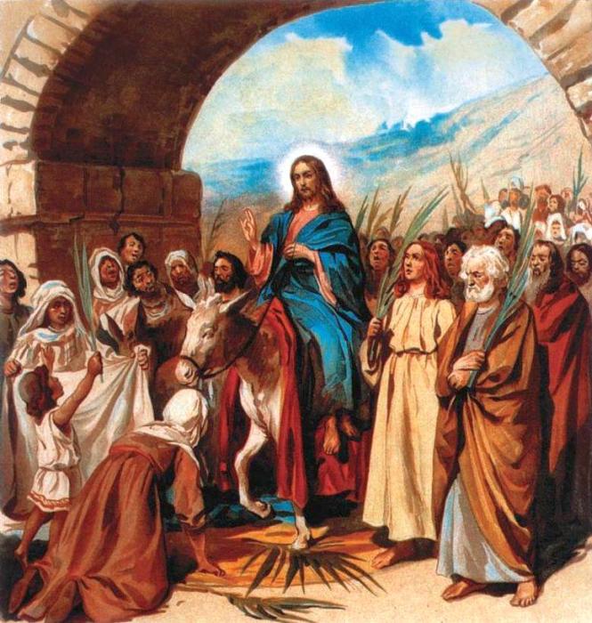 За несколько дней до Своих крестных страданий Христос отправился в Иерусалим для празднования Пасхи. Он въехал в город на молодом осле, что для иудейского народа было символично: по древнему обычаю именно на осле въезжали в город цари-победители, а в военные походы отправлялись на коне.