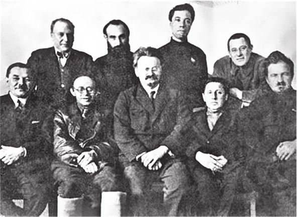 Александр Белобородов среди лидеров левой оппозиции. Сидят (слева направо): Леонид Серебряков, Карл Радек, Лев Троцкий, Михаил Богуславский и Евгений Преображенский; стоят: Христиан Раковский, Яков Дробнис, Александр Белобородов и Лев Сосновский. 1927 г.