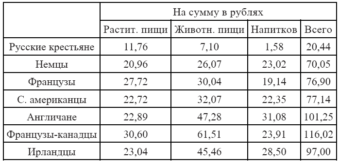 Академик князь Тарханов в статье “Нужды народного питания” дал таблицу потребления пищевых продуктов крестьянами различных стран в денежных единицах на человека в год: