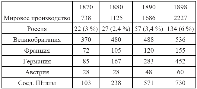 Теперь посмотрим, как у нас обстоят дела в области черной металлургии. Это видно из таблицы мирового производства чугуна и стали (данные приводятся в млн пудов).