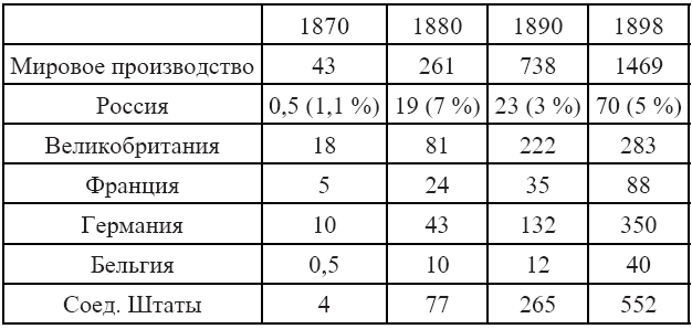 Тут интересен даже не столько «русский процент», сколько доля в мировом производстве Великобритании и Германии, ни по размерам, ни по населению, ни по ресурсам не сопоставимых с Россией. США производили еще больше, но они по крайней мере хотя бы сравнимы с нами по всем этим показателям. При этом надо не забывать, что большинство металла в России съедали железные дороги. Так, в 1881 году было произведено стальных рельсов и прочих железнодорожных причиндалов 12 612 тыс. пудов (около ⅔ произведенной в России стали), а в 1896 г. – 24 300 тыс. пудов (около ⅓).