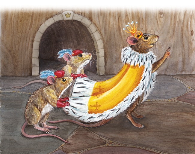 Выслушав кота, королева-мышь наконец появилась из норки. Голову её украшала корона, а горностаевую мантию поддерживали два мышонка, у которых при виде страшного собеседника королевы шёрстка встала дыбом.