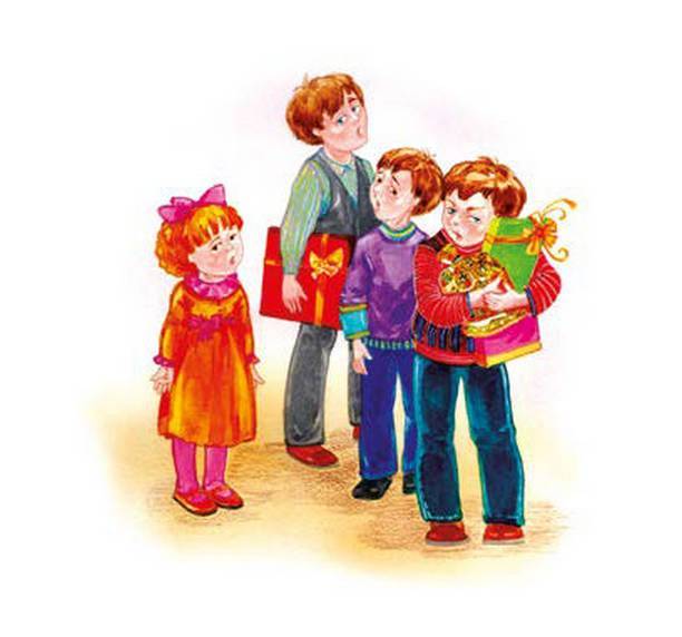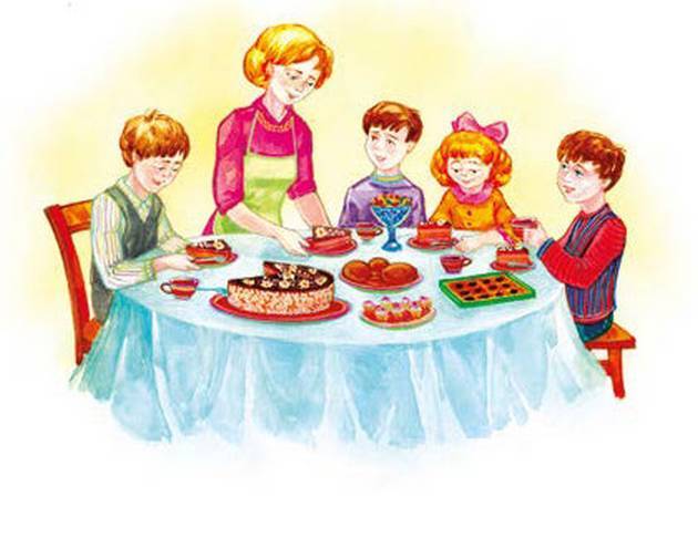 Сразу весело всем стало.Значит, жадность убежала.Так легко и так чудесно,Что ни в сказке рассказать!Мама всех за стол сажает.Чай и тортик предлагает.Дорогие мои дети,