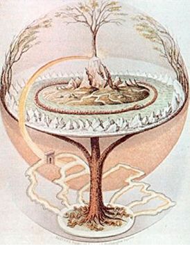 Весь мир же в представлении древних скандинавов был как дерево – ясень Иггдрасиль, ветви которого простираются над всеми мирами. На вершине его сидит орёл, в середине четыре оленя щиплют его листву, а дракон Нидхёгг и змеи грызут его корни, по стволу носится белка Рататоск, чтобы передавать новости с вершины к корням. Иггдрасиль соединяет верх (небо), середину (земля) и низ (подземный мир). На небе, которое по углам поддерживают четыре дверга с именами сторон света (Аустри, Вестри, Нордри и Судри), находятся крепость богов-асов Асгард и палаты Одина – Вальгалла. В подземном мире – царство мёртвых богини Хель и разнообразные водные источники. В центре округлой земли располагается обиталище людей – Мидгард. На востоке находится страна великанов – Йотунхейм. Землю омывает Мировой океан, в глубинах которого пребывает чудовищный змей Йормунганд.